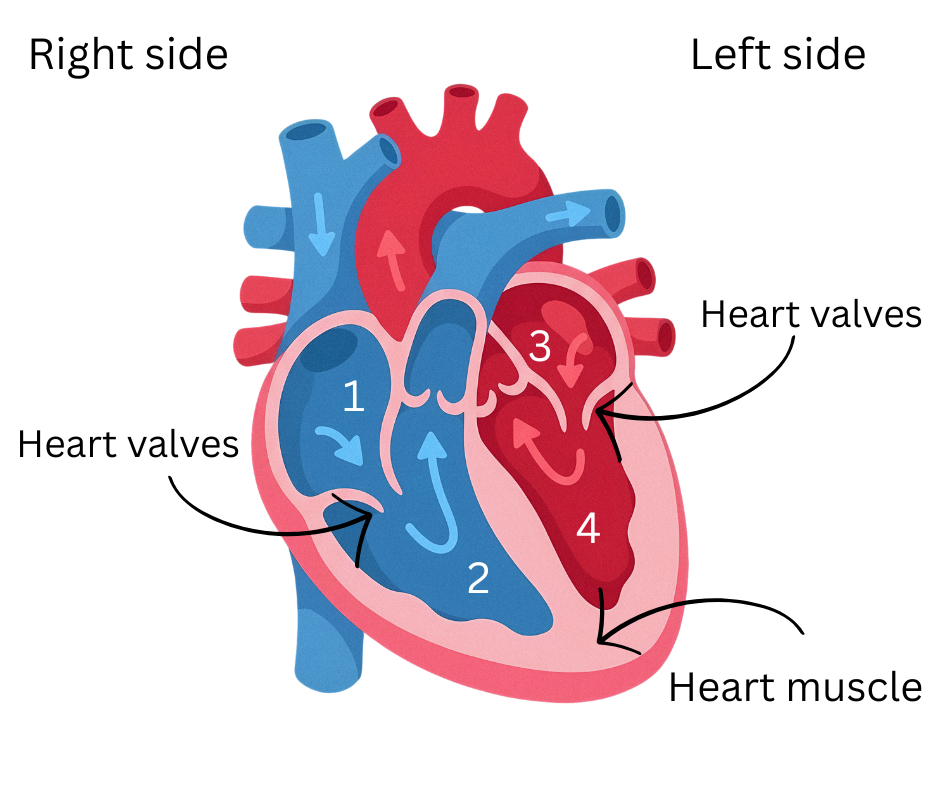 Just like humans, an animal's heart acts like a pump to push blood around the body. The hearts pumping power lies in its muscles. These are normally thick and powerful, helping the blood reach as far as the outer extremities of the body. The right side of the heart (blue) sends blood to the lungs where it picks up oxygen. The left side of the heart (red) pumps the oxygen rich blood around the body. Inside, the heart is divided into four chambers. In between the upper and lower chambers are the heart valves, which open and close in sequence to make sure that the blood flows in the right direction. The following diagram illustrates this.